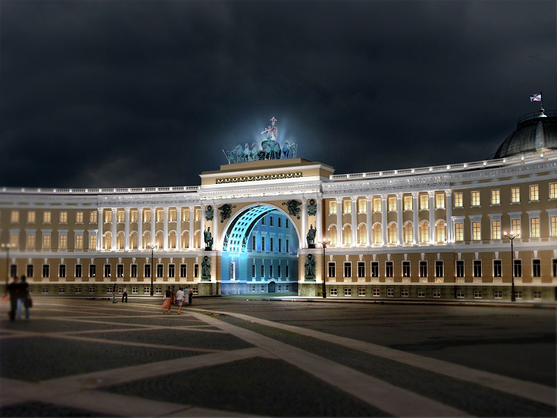Важна и температура света. Весь объем здания предлагается залить теплым белым светом. Это подчеркнет стиль и придаст торжественный вид зданию. А колоннады центральной группы и боковых фасадов подчеркнуть приборами с более низкой температурой света. Внутреннее пространство арки предлагается высветить цветным светом. Это создаст дополнительные акценты в общей световой композиции и придаст торжественность за счет контраста внутреннего пространства и внешнего объема фасада.
