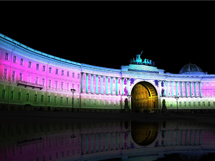 Предлагается разбить процесс подсвечивания фасада здания на две стадии. Первая стадия — белая подсветка. Белый цвет по своей природе нейтрализует, поглощает основные цвета и соотносится с пустотой, бестелесностью. Автор преобразует здание штаба, обесцвечивая его, лишая его тектоничности, объема, материальности.
