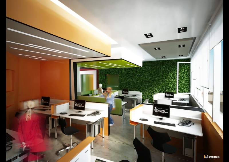 Помещение офиса делится на зоны, расположенные по функциональному принципу. Справа от reception располагается клиентский отдел, переговорные, финансовый отдел и кабинет руководства; слева — административно-хозяйственный и медиа отделы, креативный отдел, санузлы, комната отдыха и мини-кухня. Зона отдыха персонала максимально озеленена и оснащена раздвижной перегородкой, объединяющей ее с кухней для проведения маленьких корпоративных праздников, и выходом на балкон. На открытом балконе расположены всесезонные скамейки и декоративное озеленение. За стойкой reception находится декоративная стена, которая отгораживает эвакуационный выход, а также служит нишей для библиотеки.