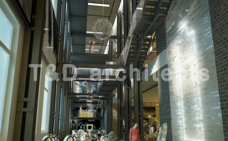Помещение представляет собой экспозиционное пространство и подходит для проведения выставок, презентаций и event-мероприятий. Для увеличения полезного пространства архитекторы предлагают использовать систему мобильных лестниц, которые компонуются по металлическим направляющим в зависимости от события, которое происходит в данном помещении. На третьем и четвертом этажах расположены офисные помещения с различной планировкой. В той части здания, где сейчас находится склад, предлагается установить на собственном фундаменте дополнительный металлический каркас и опереть на него дополнительные этажи, что позволит существенно увеличить полезную площадь помещения. В результате проектируемых мероприятий площадь здания увеличится более чем на 1000 квадратных метров.