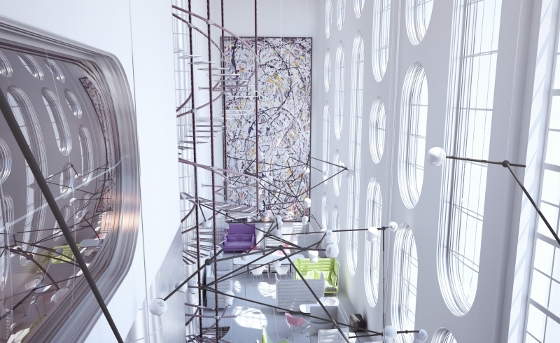 Офисные помещения компаний, связанных с тем или иным производством, предполагается разместить на втором этаже. Офисные помещения на втором, третьем и четвертом этажах предлагаются двух типов: «малые офисы» с нарезкой по 15–20 квадратных метров, выделенные в отдельный блок, и «большие офисы» свободной планировки площадью 80–100 квадратных метров, спланированные по заданиям конкретных фирм-арендаторов. Одним из самых интересных помещений в корпусе является трехсветная галерея -атриум, идущая вдоль всего заднего фасада. Архитекторы предлагают использовать его в различных качествах. Это и «буфер обмена идеями», open office, где люди работают вместе в общей открытой зоне, это и выставочное пространство, и кинозал, и шоурум. Однако это и офисное помещение, где есть индивидуальные рабочие места, выполненные в виде капсул с полупрозрачными стенками — «тьюбиклов». Они устраиваются один над другим, и ярусами поднимаются до самого потолка.