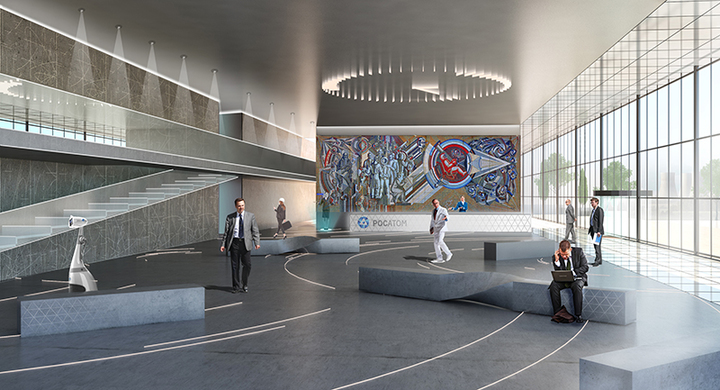За основу для тонких, синусоидально-параболических очертаний архитекторы взяли образы математического моделирования, параметрические описания взаимодействия полей, частиц. Формы светильников придают интерьеру узнаваемость, отсылая к прообразам траекторий движения частиц в ускорителе (трекинг частиц), а также образ ленты Мёбиуса.