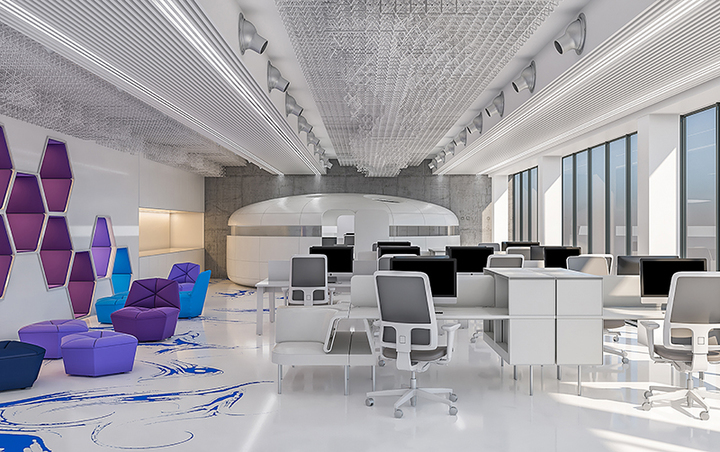 Архитекторы разбили пространство на отдельные зоны, каждая из которых несет свою смысловую нагрузку и свой дизайн-код: информационно-познавательная площадка Форум для выставок, презентаций и тренингов, специальные кубы для хранения, которые, при необходимости, можно использовать в качестве дополнительных посадочных мест, и даже портал для взаимодействия предприятий отрасли по всему миру.