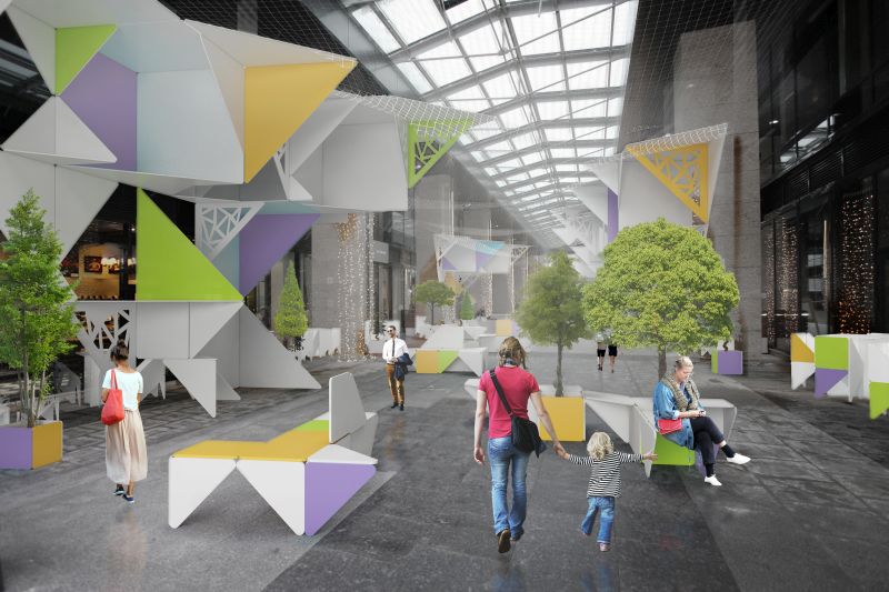 Предлагается использовать модульную систему, которая состоит из нескольких базовых элементов, позволяющих создавать среду под любое мероприятие. Модули представляют собой плоские и пространственные элементы, с размерным шагом 400 мм, от небольших треугольных плоскостей, служащих для формирования поверхностей стен и подиумов, до любых конфигураций, из которых легко собрать предметы мебели. Основной материал модулей – бакелитовая фанера, которая крепится на уголки и болты. Также может использоваться пластик и текстильная обивка – предусмотрена большая вариативность размеров и материалов. Постоянным элементом служит натянутая над всем пространством Аркады сетка, которую возможно по-разному оформить или подсветить.