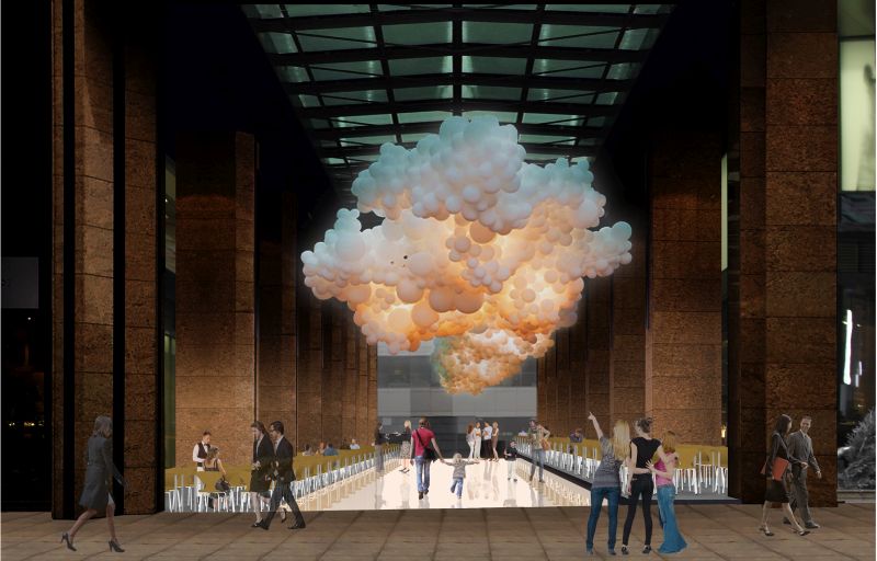 Создать более интересное общественное пространство предлагается за счет интегрирования разноуровневых платформ. Такое пространство способно адаптироваться под разные праздничные и бизнес-мероприятия, а также удобно для организации ресторанных патио. Для центральной платформы, связывающей Лесную улицу и 3-й Лесной переулок, в качестве материала используется отпoлированный белый бетон – этот прочный материал обладает высокими светоотражающими характеристиками, что является дополнительным плюсом при создании инсталляций под потолком.