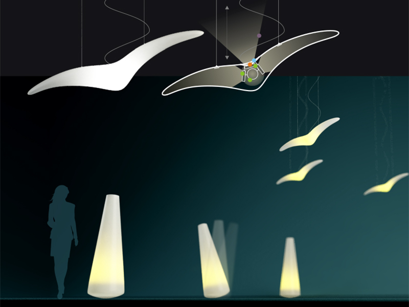 В комплект Oceano входят светильники-буйки и светильники-чайки. Буйки сделаны качающимися, чтобы люди проходя мимо, не боялись бы их случайно задеть и уронить, и возможно, даже задевали бы их специально, ради забавы. Чайки-светильники являются неотъемлемой частью композиции, усиливая образ, связанный с водой, и помогая в организации пространства. Они подвешиваются к потолку по условной траектории движения людей или в свободном порядке на разной высоте. Буёк представляет собой полую форму-неваляшку, в которой в качестве противовеса используются гранулы исходного материала LLDPE. Они засыпаются внутрь светильника уже по месту установки через специальный люк снизу светильника. Через этот же люк происходит монтаж световой арматуры. Верхнее отверстие накрывается прозрачным отражателем.