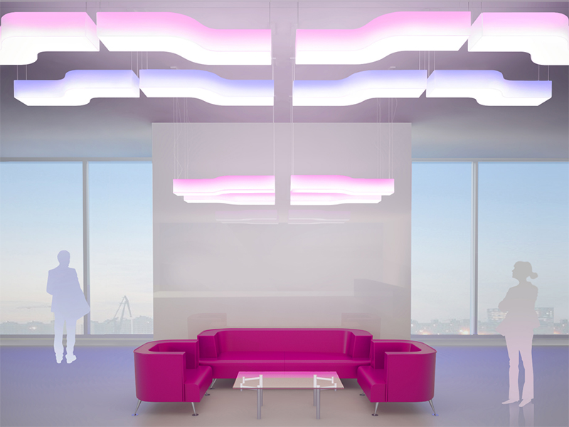 Главная идея светильника — лирическое решение практических задач. Пластика формы и цветная подсветка вертикальных граней создают эффект «ленты» северного сияния. Направленный вниз теплый белый свет обеспечивает равномерное комфортное освещение. Главная особенность — за счет формы светильник обладает интересными комбинаторными возможностями. Даже при простом размещении в ряд светильники могут образовать несколько типов линейного рисунка, а их вариации за счет смещений и смены ритмов дадут возможность создавать динамичные и каждый раз уникальные композиции. Плафон светильника выполнен из светопропускающего белого материала с высоким коэффициентом рассеивания. Плафон выполнен методом формования. Источник света — энергосберегающие лампы. Длину подвеса можно регулировать.