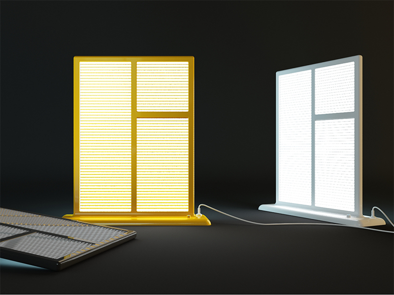 Светильник в виде закрытого жалюзи окна с подоконником. На подоконнике находится кнопка включения/выключения, она же служит диммером. Быстрое двойное нажатие кнопки включает заднюю подсветку, а поворачивая кнопку, можно изменить ее цвет. Ширина первого — настольного — варианта светильника 300 мм, высота — 420 мм. Второй вариант — настенный — имеет большие размеры: ширина 900 мм, высота 1300 мм. Настольный вариант может играть роль не только источника света, но и ширмы, настенный вариант может выполнять функцию окна в помещениях без окон. «Окно» работает на светодиодах, что увеличивает срок его службы.