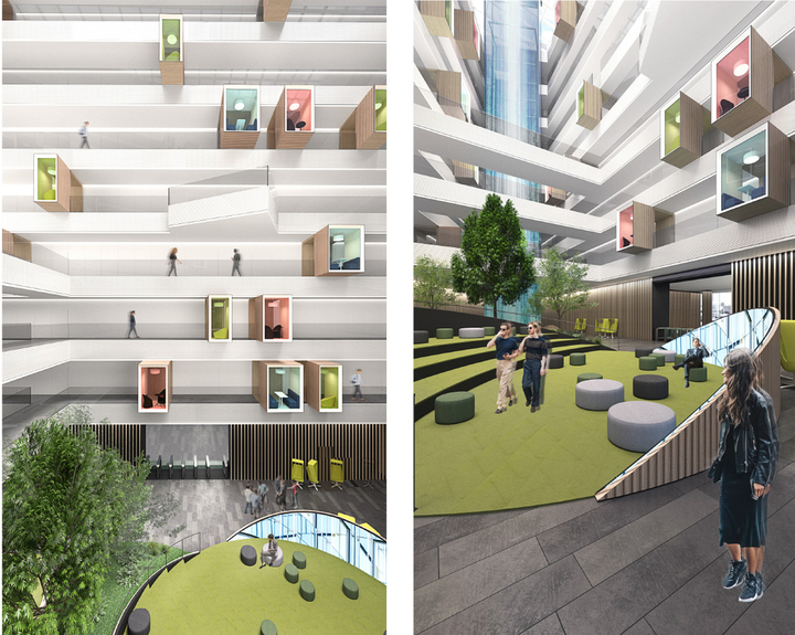Телевидение - это призма, которая пропускает через себя информацию и выдает многогранный контент «КАЛЕЙДОСКОПА СОБЫТИЙ». Сам интерьер становится таким калейдоскопом: лифтовые шахты одеваются в медиа-фасад, многофункциональные кабины могут использоваться как фокус-комнаты или переговорные. Ядром НТВ становится атриумная зона. Это место для мероприятий, брифингов, отдыха и зона VR.