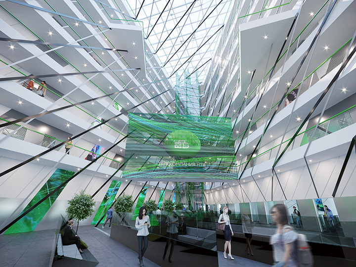 Интерьер - это сама сущность компании, это процессы, которые происходят внутри и отражаются на еще одном, внутреннем фасаде. Идея, объединяющая архитектуру и интерьеры - это ромбическая сетка, которая перекликается с фасадом, напоминает конструкцию Шуховской башни, а также символизирует ретрансляционную сеть и сетку вещания. Атриум становится огромным арт-объектом, объединяющим символом интерьера, пронизывающим все этажи, центральным смысловым ядром, вокруг которого строится весь интерьер. Весь атриум трактуется как медиапространство с медиафасадом на мостах и небольшими экранами на этажах вокруг него.