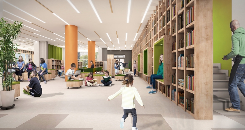 Среди “фишек” проекта: автоматы для книг, высокий стеллаж с книгами и проходом внутри (позволяет брать книги с верхних полок без дополнительного оборудования), геометрический рисунок пола для подвижных игр.