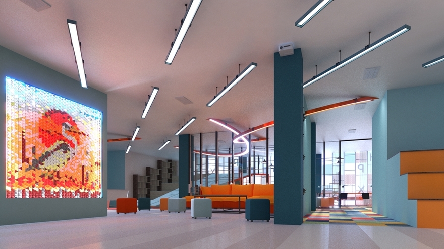 Пространство разделено на две принципиально разные части, что позволяет функционально разграничить рабочую и развлекательную зоны. Разделение происходит за счет использования напольного покрытия с отличающимися тактильными характеристиками. Тихие зоны выделены стеклянными перегородками для лучшей инсоляции. Минималистичное колористическое решение с яркими акцентами визуально увеличивает высоту библиотеки и делает площадку нестандартной.