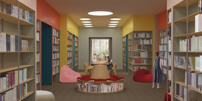 Библиотека-коворкинг – пространство взаимодействия, которое в противовес привычной школьной планировке, лишено коридорной системы с жестким делением на кабинеты. Организованные зоны плавно перетекают друг в друга, но при этом сохраняют четкую структуру и иерархию. Сохраняется возможность разделения на детскую и взрослые зоны. Центральным ядром, связывающим все помещения, является читальный зал. В него можно попасть напрямую практически из любого помещения. Несмотря на такую проницаемость предусмотрены небольшие комнаты для уединения. В них создана атмосфера «домика из одеял» или «шкафа с фонариком».