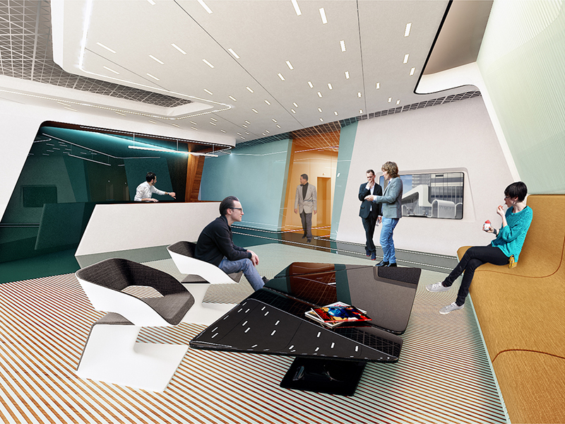 Концепция подразумевает создание динамического интерьер для динамично развивающейся компании. Световые линии, диагонали и угловатые формы оживляют интерьер. Бесшовные материалы, глянцевые поверхности с плавными изгибами задают современный тон. Цвет и фактура подобраны таким образом, чтобы создать контраст между «искусственным» и «естественным». Среди прохладных масс искусственного полированного камня встречается теплая фактура дерева, мягкая тканевая обивка на диванах – эти элементы уравновешивают интерьер.