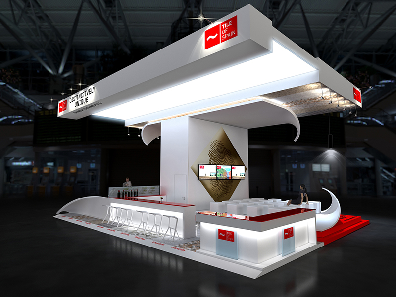 В основе проекта лежит образ разворачивающихся чистых листов бумаги, раскрывающих посетителям выставки бесчисленное множество узоров, текстур и форм плитки, выпускаемой под брендом Tile of Spain. Стенд открыт со всех сторон, как бы приглашая посетителей зайти.Он выдержан в белой гамме с ярко-красными акцентами, напоминающими о логотипе компании. За освещение отвечает общий рассеянный свет и отдельные светильники, дающие направленный свет на определенные участки. Современные материалы и мебель, которые использованы на стенде, демонстрируют стремление компании к инновациям. Центральный элемент стенда — эффектная гигантская плитка с логотипом компании в виде отпечатка пальца. Полы в зоне рецепции и в барной зоне выложены плиткой из коллекций компании. Кроме этого, на стенде есть еще зона презентаций и лаундж-зона.