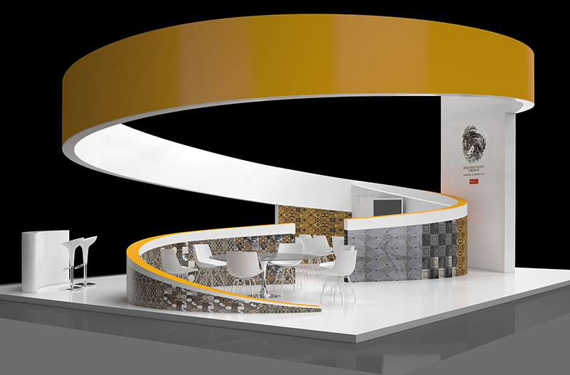 Стенд сформирован закрученной полувосьмеркой лентой, которая выложена плиткой из коллекций Tile of Spain. При взгляде сверху стенд напоминает символ «инь и янь», отсюда и название проекта — The Sign («Знак»). Общая гамма выдержана в золотисто-серебристых тонах. На внешней стороне опоры, от которой отходит лента, расположен логотип компании в виде отпечатка пальца.Лента-волна делит пространство стенда на две части: гостевую и промоушен-зону и ресепшен с конференц-зоной. Предполагается, что основная часть стенда будет сделана из акрила или гипсокартона, а подвесная часть ленты — из полистирола.