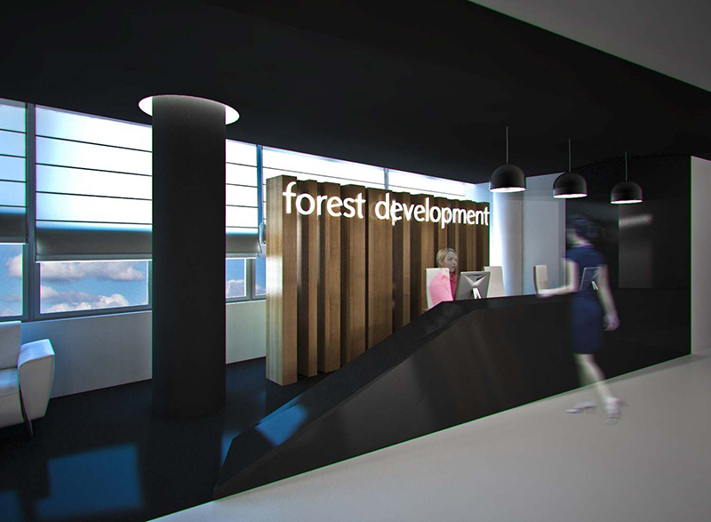 Планировочным решением выявляется концептуальное ядро офиса, вокруг которого закручиваются основные помещения офиса. Визуально этот эффект создается путем использования контрастных отделочных материалов – внутренняя часть яркая и активная, внешняя гораздо более спокойная. В представленном примере декорирование стен с внутренней стороны коридора выполняется из черного пластика и деревянных панелей, с металлическими хромированными вставками, с внешней стороны – из глянцевых белых панелей. Напольное покрытие – наливной глянцевый пол – в зоне ресепшн черного цвета, в зоне коридора белого цвета. В лаундж зоне предлагается сочетать все выбранные фактуры отделки.