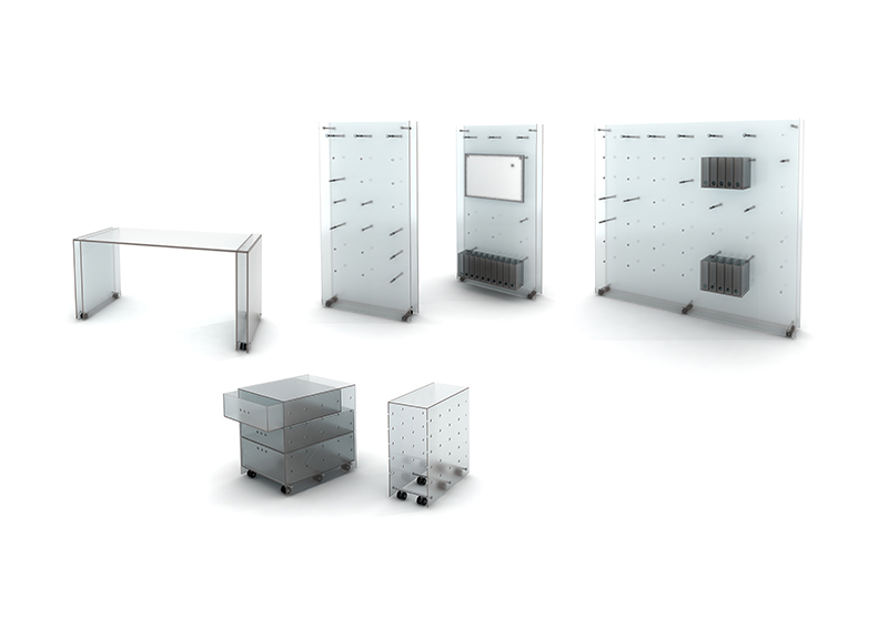 Основная идея – комфортное зонирование и увеличение рабочего пространства. Задача решается за за счет легких перфорированных перегородок с набором модульных креплений, которые могут также работать в качестве открытых систем хранения. Предусмотрено использование дополнительных приставных элементов. Вся мебель мобильна и может использоваться, как по отдельности, так и комбинаторно.