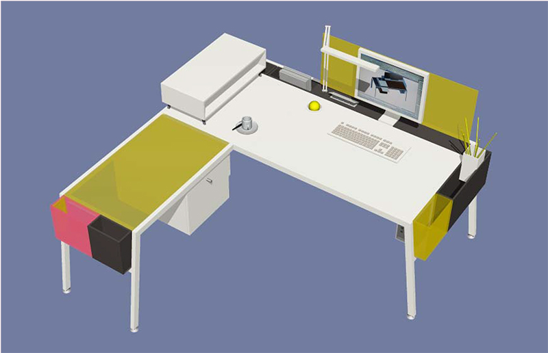 Основу системы для рабочей зоны в open space составляет рабочий стол и модульный стеллаж для хранения документов. Стол со съемной столешницей, оборудованной механизмом изменения угла наклона, дополнен вмонтированными и навесными карманами для хранения. Противоположные ножки стола отличаются углом наклона, что позволяет собирать рабочие столы в блоки в продольно-поперечном направлении. Количество комбинаций увеличивается благодаря возможности использовать в качестве опоры для стола дополнительные приставные тумбы. Модульный стеллаж с возможностью доступа с двух сторон удобно использовать в open space в качестве перегородки.