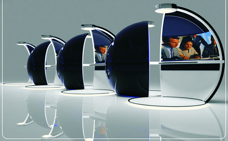 Рабочее место заключено в стеклянную сферу и состоит из столешницы, в которой расположен системный блок и выдвигающаяся клавиатура, двух стоек, выполняющих функцию держателей столешницы, и механизма, передвигающего элементы сферы вокруг оси. В стойки интегрированы споты, динамики и web-камера. Несомненным плюсом конструкции является возможность отгородиться от окружающего пространства и полностью погрузиться в работу. В то же время, в открытом виде рабочие места занимают немного места и легко объединяются в удобный рабочий комплекс. Сфера выполнена из «умного стекла», которое может менять прозрачность и цвет. Другие материалы: ДСП и металл.