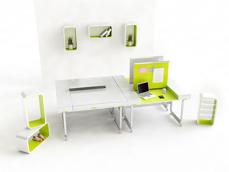Главным достоинством стола является возможность быстро переходить от индивидуальной к коллективной работе. Кроме того, если у сотрудника появляются срочные дела, он может не тратить время на разбор вещей, а просто закрыть крышку, чтобы иметь возможность использовать свободную поверхность. Шкаф для хранения бумаг универсален: его можно поставить как вертикально, так и горизонтально. Для вертикального варианта предусмотрены полки и ящики.