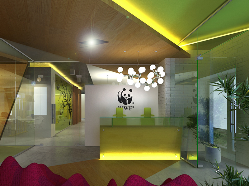 Офис WWF – это экосреда, где каждый этаж здания символизирует четыре стихии: огонь, землю, воду и воздух. Ствол «Дерева жизни», проходя через все этажи, объединяет стихии в единую систему существования мира. В интерьере диагональные формы символизируют ветви дерева и помогают зонировать пространство. Для каждого этажа определены своя колористическая гамма, графика и оформление. Преимущественно стены покрыты белой краской (крашенный кирпич). Отдельные выступающие части стен выделены яркими цветами – на них размещаются слоганы и принты с мотивационным посылом для посетителей и сотрудников.