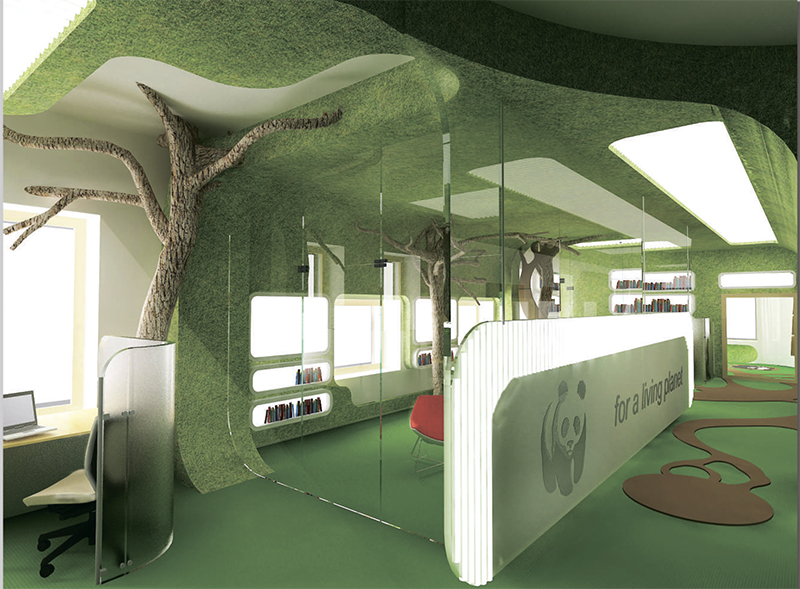 Конференц-зал, переговорные и зону отдыха в подвальном этаже предлагается объединить в одно многофункциональное помещение. Разделять пространство возможно с помощью звукопоглощающих перегородок NAYADA-Hufcor. На крыше возможно разместить гелиоконцентраторы, благодаря которым дневной свет сможет попадать в самые отдаленные уголки Панда-дома.