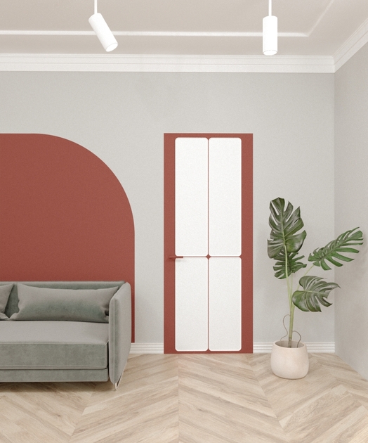 В приведенных на конкурс вариантах демонстрируется использование зеркала и алюминия с последующей покраской. Использование зеркальной поверхности делает дверь едва заметной, а узкая алюминиевая окантовка делает будущую дверь необычайно элегантной и воздушной.