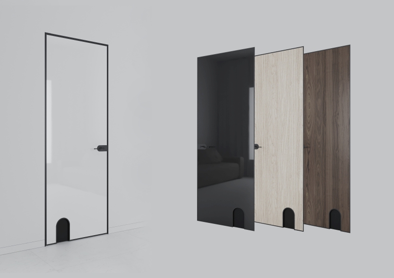 Дверная система ТОМ основана на базе серии ESTET. Сам алюминиевый профиль практический полностью скрыт за лицевыми панелями. С лицевых сторон по периметру дверного полотна проходит узкий 10-ти миллиметровый алюминиевый кант. Нижний профиль дверного полотна имеет аркообразную вставку, в котором располагается гибкая пластиковая дверца для домашних питомцев. Площадка для дверной ручки имеет схожую форму. Дверные петли скрытые. В качестве лицевых панелей дверного полотна может использоваться либо стекло либо МДФ.