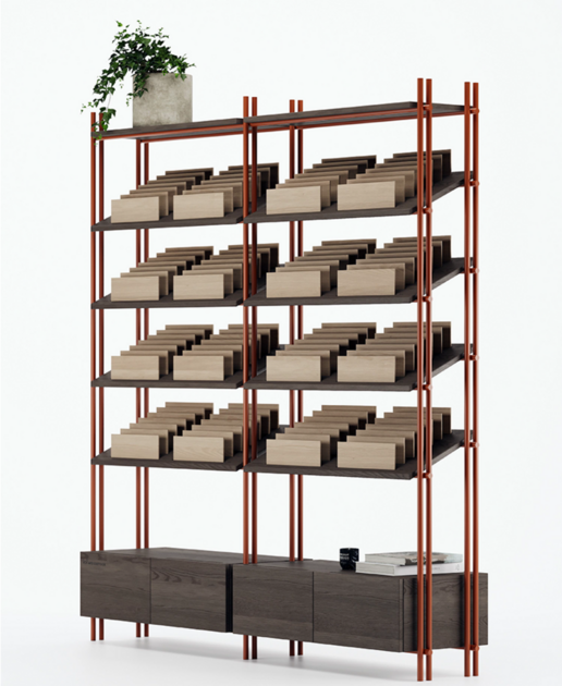 Один модуль рассчитан на 56 образцов размером 300 на 100. Предусмотрены ящики для хранения каталогов. Каждый модуль рассчитан на 4 каталога. Логотип сделан с помощью фрезеровки на ЧПУ станке и последующей заливки эпоксидной смолы.